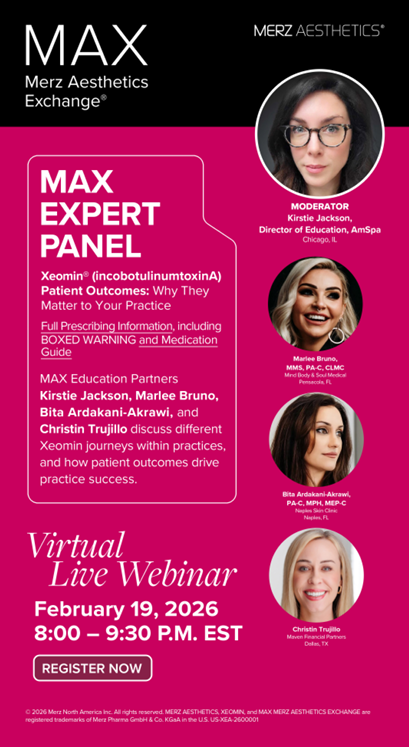 Merz Aesthetics Exchange (MAX) invites AmSpa Members and the medical aesthetic community to a virtual, live webinar on February 19 featuring MAX Expert Panel insights on Xeomin (incobotulinumtoxinA) Patient Outcomes: Why They Matter to Your Practice.
